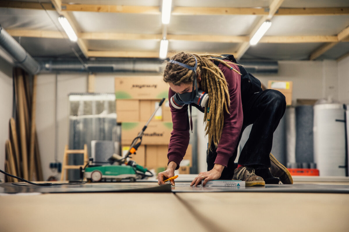 Härtere Randstreifen, die die Kanten begrenzen, verleihen der Matte Stabilität und senken das Verletzungsrisiko beim Bouldern. Die Oberseite beziehen wir wahlweise mit verschiedenen Ausführungen aus PVC-Plane (Vinyl) oder Teppich. Damit die Abdeckung hält, befestigen wir sie abschließend an den um die Matte laufenden Holzrahmen, den wir gleichzeitig im Boden verankern.