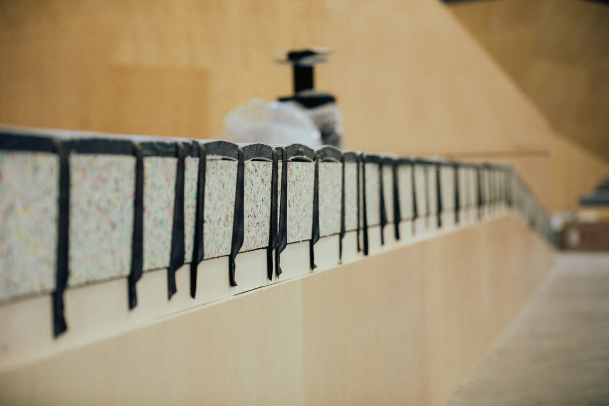 Das Obermaterial bestimmt auch den Härtegrad des Fallschutzes: Die weichste Matte hat eine reine PVC-Oberfläche, die auf der Boulderwandseite optional mit einem umlaufenden Teppichband versehen werden kann, das individuell an die Wandform angepasst wird. Dieses Band kann 1 bis 1,50m breit sein und hilft, die Boulderwände und -griffe sauber zu halten, da es einen Großteil des Schuhabriebs, Staubs und Chalks aufnimmt. Die PVC-Oberfläche ist in allen RAL-Farben erhältlich, das Teppichband ausschließlich in hellgrau. In den von uns ausgestatteten Hallen könnt ihr euch einen genaueren Eindruck von unseren Matten verschaffen.