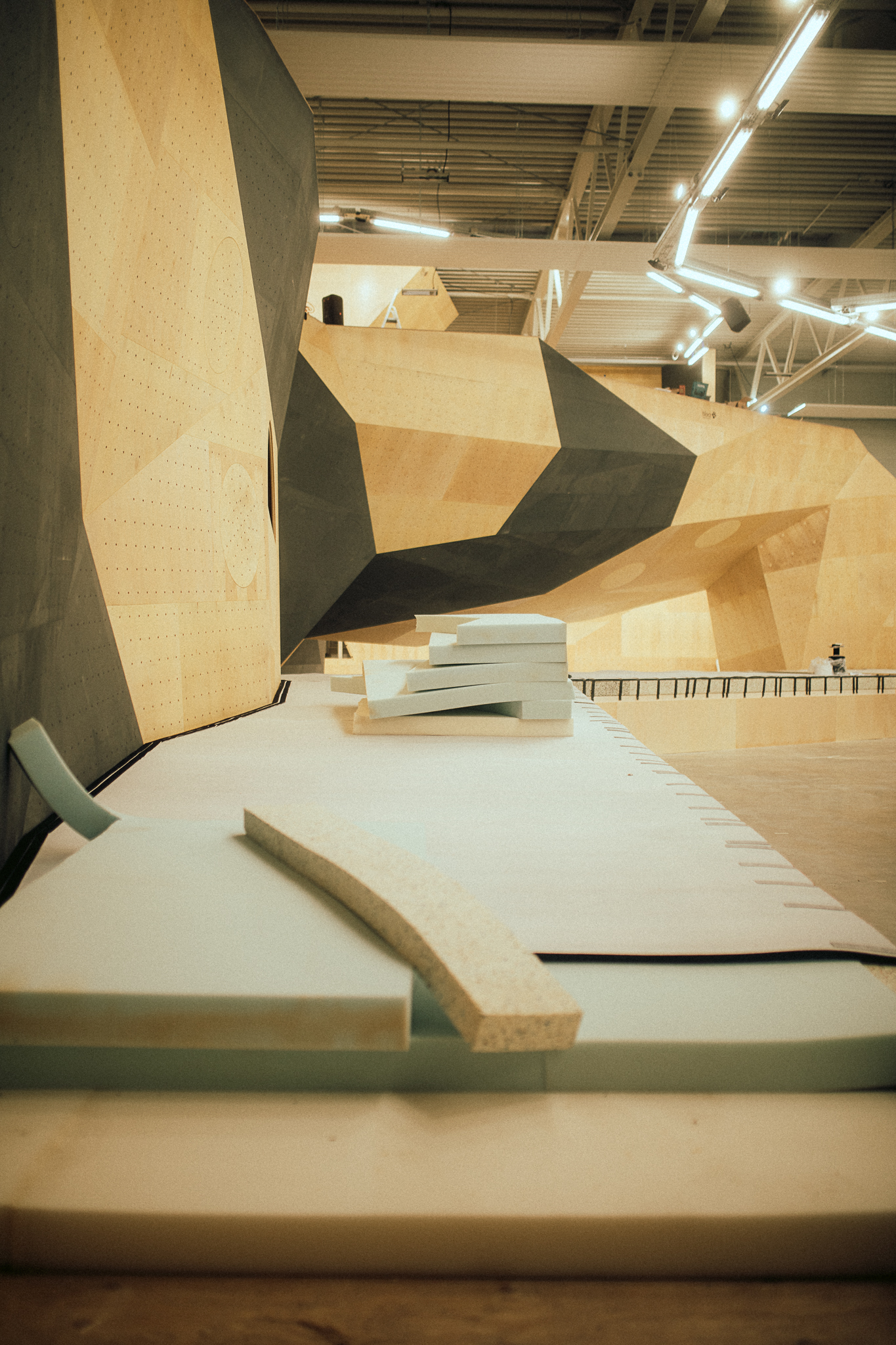 Hergestellt nach DIN EN 12572 und geprüft, besteht das etwa 30 cm hohe Mattensystem von Blocz aus verschiedenen Elementen: In einem Rahmen aus Multiplex-Platten liegt zunächst ein Kern aus weichem Schaumstoff. Darüber befinden sich weitere Lagen aus festerem Schaumstoff. On Top kommt ein Druckverteiler, der den Druck auf der Bouldermatte verteilt.