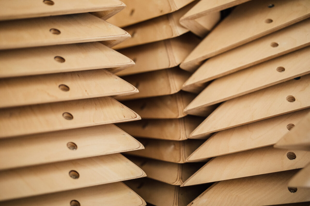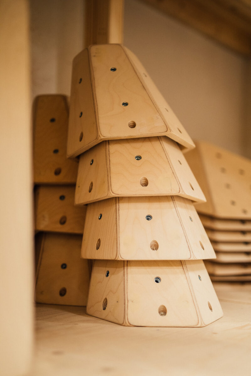 Unsere Kletterwandvolumen bestehen aus schnell nachwachsendem Birkenholz, verleimt zu robusten 13 Lagen. Auf den 18 mm dicken und dennoch flexiblen Unterbau bringen wir unsere einzigartige Supergrip-Beschichtung auf. Hält richtig gut – und vor allem lange.